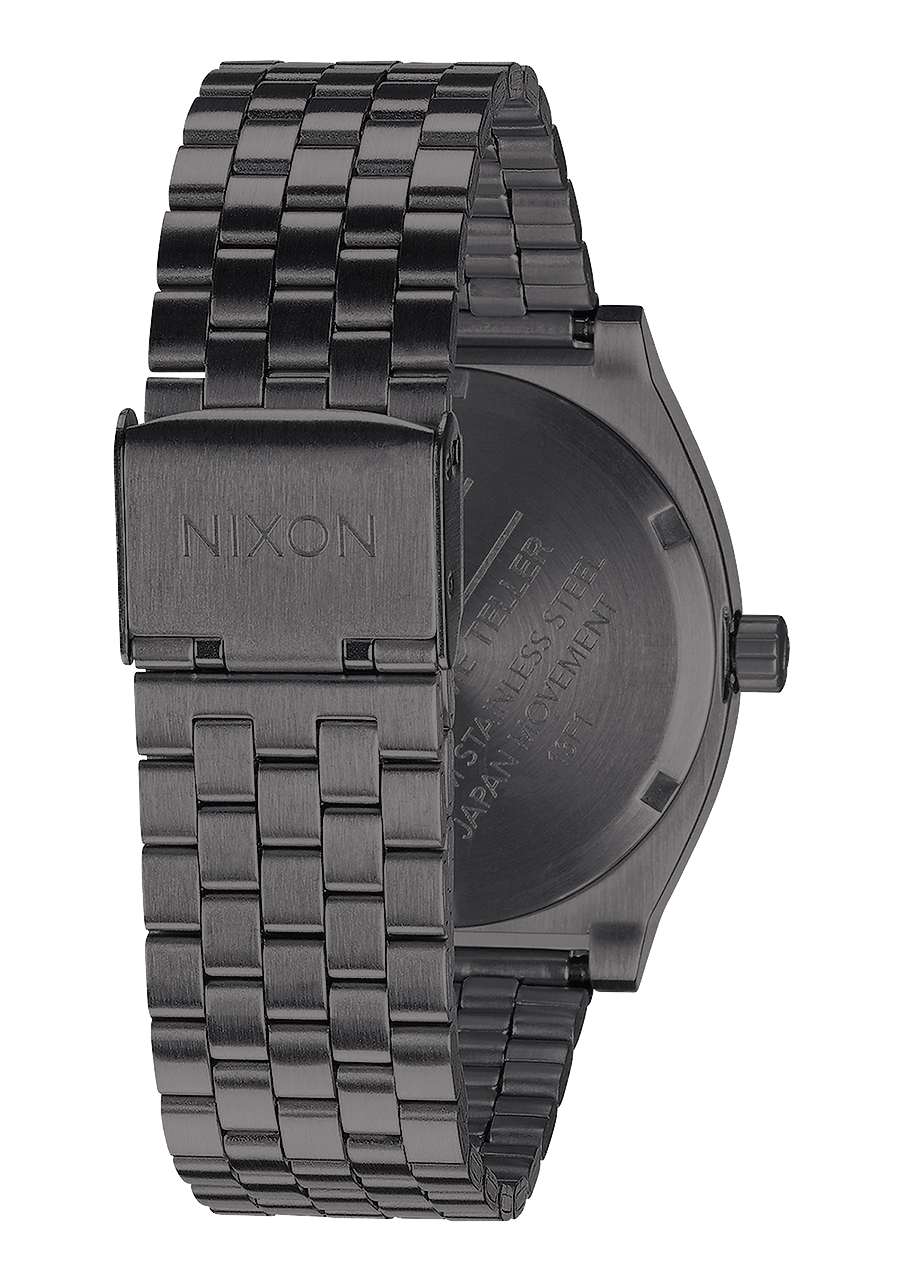 The Nixon Time Teller watch features a solid stainless steel case and a stainless steel bracelet, making it durable for daily wear and a hardened mineral crystal for added protection. The stainless steel case and bracelet provide protection against daily wear and tear, ensuring longevity and reliability.