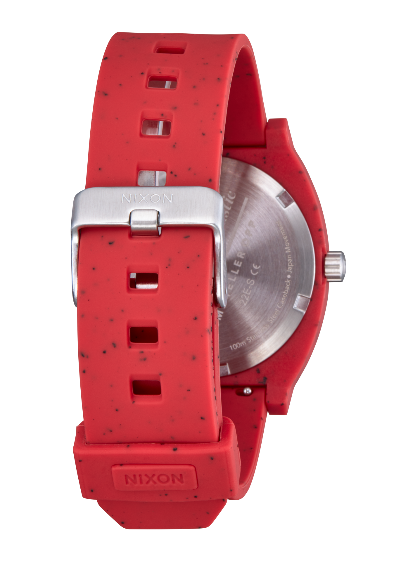 39.5mm recycled plastic case and solid steel fixed bezel with a 100 meter / 10 ATM water rating. Comes with a hardened mineral crystal, triple gasket stainless steel crown, stainless steel screw down caseback and spring pin lugs.