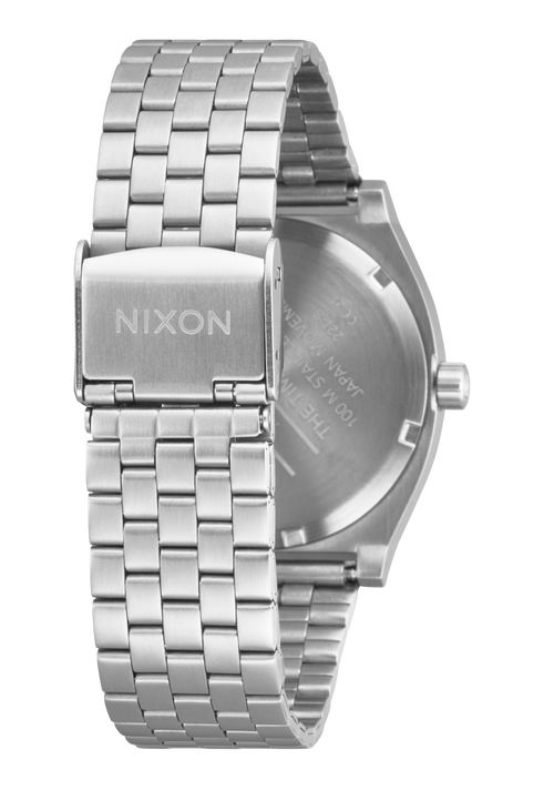 The Nixon Time Teller watch features a solid stainless steel case and a stainless steel bracelet, making it durable for daily wear and a hardened mineral crystal for added protection. The stainless steel case and bracelet provide protection against daily wear and tear, ensuring longevity and reliability.